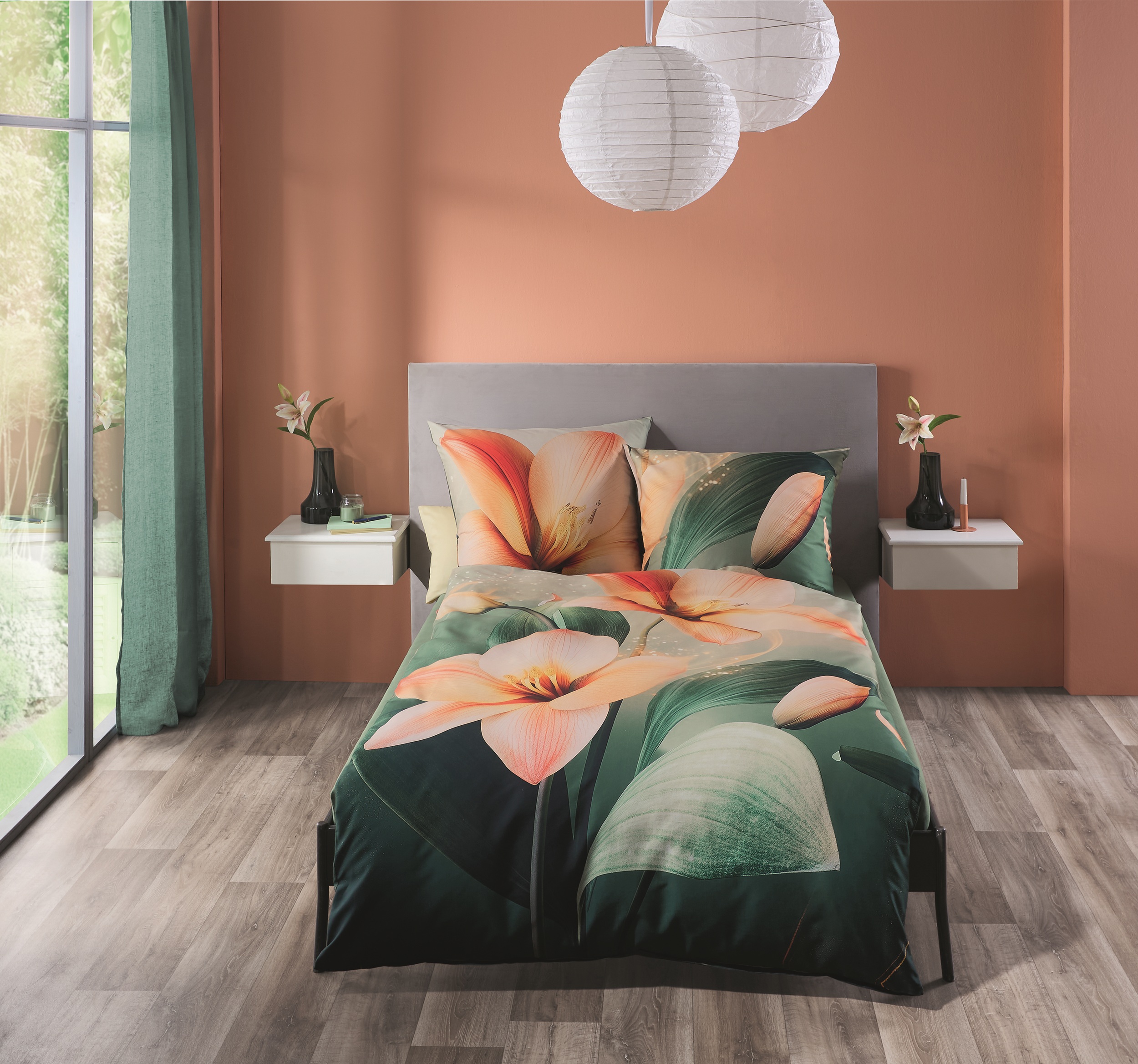 Bed cloths (with and without case), fitted sheet, sheet, quilt cover, cushion cover, pillowcase, quilt, comforter, bedspread, cushion, pillow, curtain, head protector, baby sleeping bag, mosquito netting, kitchen apron and glove, runner, napkin, table cloth, pot holder, bag and pouch produced from woven fabric made of CO (also brushed, pique, muslin), CO/EL, CO/CLY, CO/PAN (PAN part dyed yarn, brushed), white and dyed, knitted fabric made of CO, white and dyed; woven fabric made of CO, CO/EL, CO/CLY, pigment dyed (ecru), reactive print on woven fabric made of CO (also brushed), CO/EL, CO/CLY; reactive digital print on woven fabric made of CO (also pique), CO/EL; pigment print on woven fabric made of CO (also brushed, pique), CO/EL, CO/CLY, CO/PES, with and without silver glitter print and glow in the dark print as well as with or without filling material made of polyester in white and with or without silicone, softener, hardener and crease resistant finish, including accessories (zipper, metal and plastic snap fastener [in colour white], transparent PES button, PES/elastodiene elastic tape, CO raw and white cord, piping, sewing and embroidery thread, white non-woven, yarn-dyed and printed label); produced using components partly pre-certified according to OEKO-TEX® STANDARD 100.