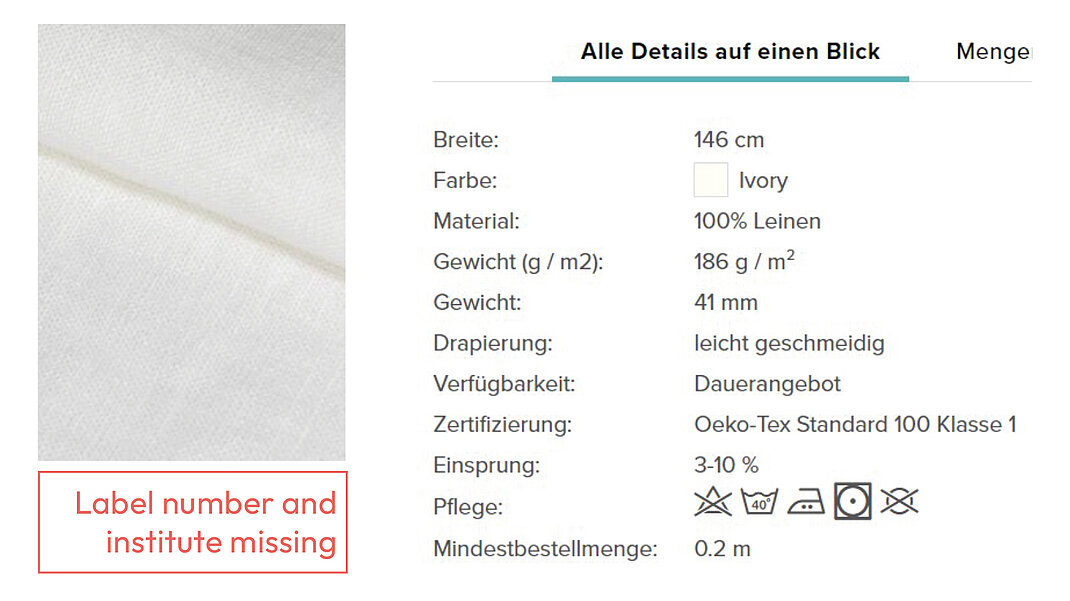 The connection with the labelled product must be always recognisable and visible for everyone. Therefore, only goods that are actually labelled with an OEKO-TEX® STANDARD 100 label may be advertised as such. This means that a STANDARD 100 label may only be displayed in brochures, catalogues, online shops or other media such as social media in connection with the product whose STANDARD 100 certificate number it bears.