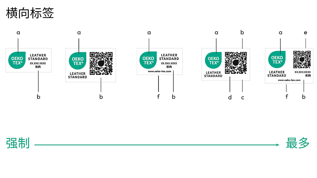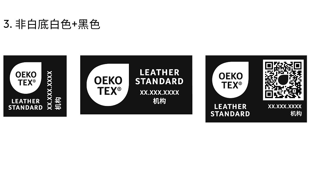 证书持有者可以通过myOEKO-TEX®平台下 载所有标签布局。若要使用其他颜色版本(包 括此处未显示的单色版本),必须先提交到 OEKO-TEX®进行审批。