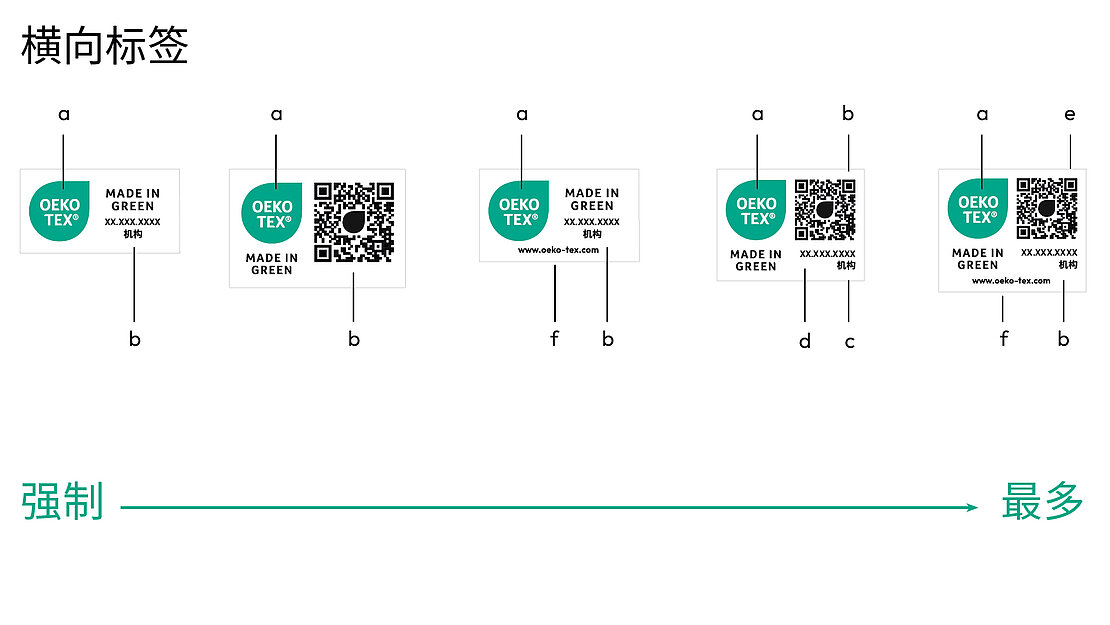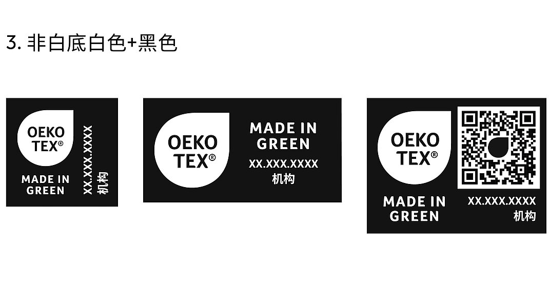 标签持有者可以通过myOEKO-TEX®平台下 载所有标签布局。若要使用其他颜色版本(包 括此处未显示的单色版本),必须先提交到 OEKO-TEX®进行审批。